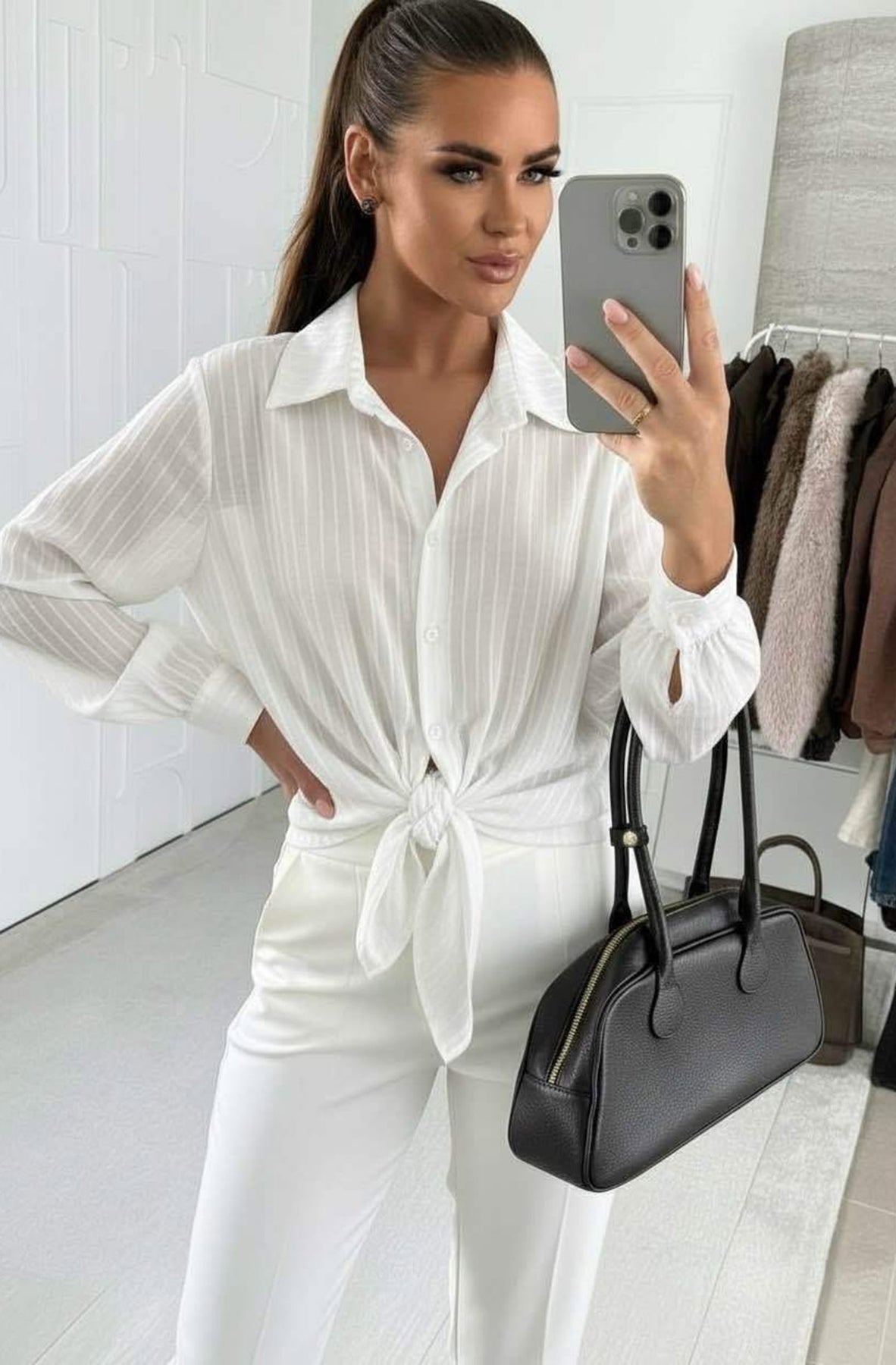 The adjustable tie-front detail allows you to style it knotted for a relaxed, feminine look or left loose for a clean, classic silhouette. Subtle vertical stripes enhance the shape, while the lightweight fabric drapes naturally for a flattering, effortless fit.